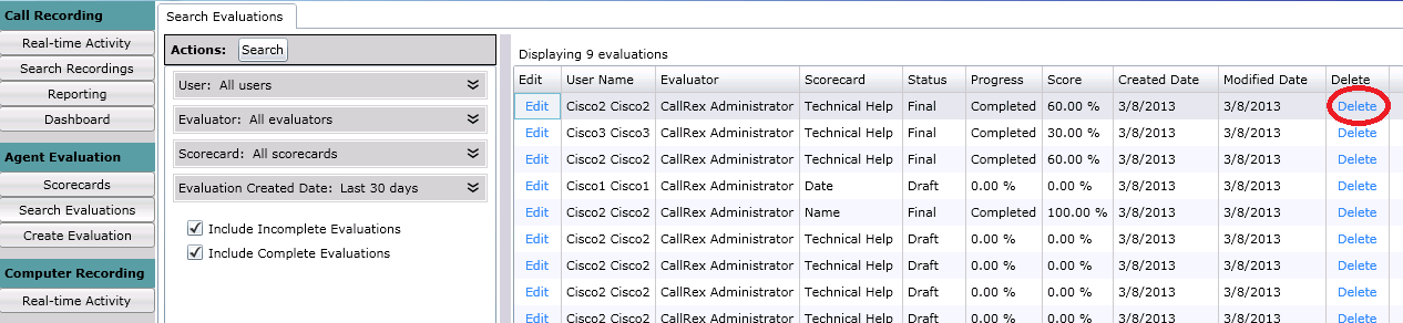 Click the Delete button in the delete column of the evaluation search results. The evaluation has been removed.
