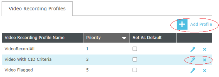 Users with the Administer Recording Profiles permission in their Security Profile can create, edit and delete Video Recording Profiles in the Video Recording Profiles List tab.