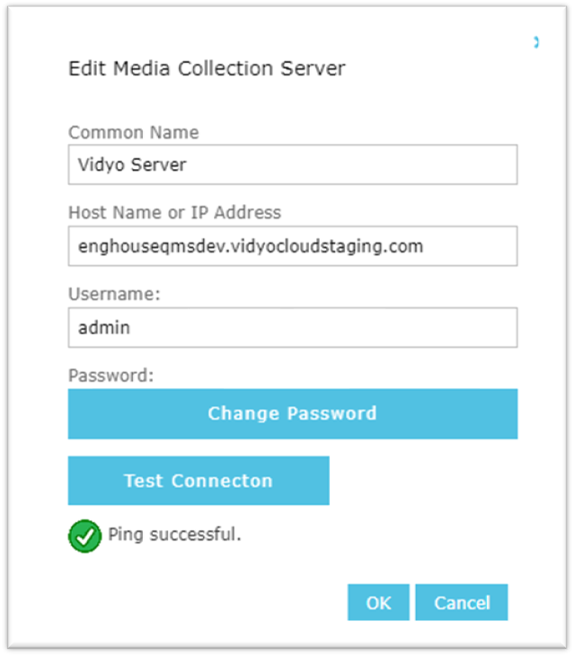 Adding a new external server or editing an existing server will pop a modal dialog where the server name, hostname, username and password can be set or changed. If the server names a Vidyo tenancy the service can be ‘Pinged” to see if it’s available and the details that have been entered are valid. A new server, or edits to an existing server are only saved if the dialogue is closed using the OK button.