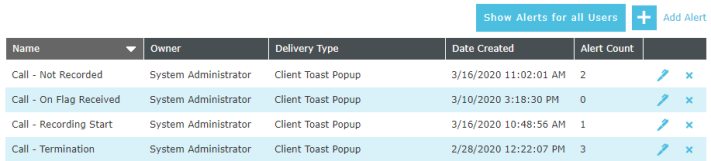 navigation icon and then click the Alerts link from the administration sub-menu. The Alerts tab displays containing configured alerts that the user can see.