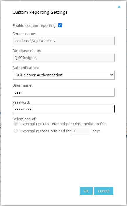 Please note that QMSInsights database is not deleted when disabling Custom Reporting, but will be cleaned if enabled with the same configuration of server name and database name.