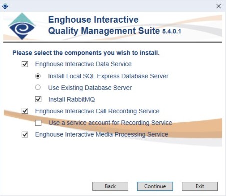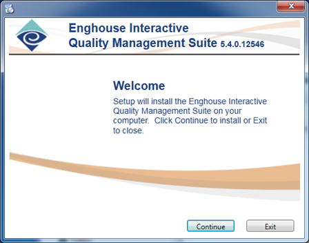 This is the first screen of the installer. You will note the version and build number is displayed at the upper right of the screen. There are two variations of this screen. If there are no QMS components already installed, then the installer knows that you are installing and you will see a ‘Continue’ and ‘Exit’ button. Also, if the Data Service, Call Recording Service and Media Processing Service are already installed, then the installer knows that you are uninstalling and you will see the ‘Continue’ and ‘Exit’ Button.