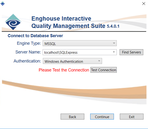 The Server Name field can either be filled in manually or if MSSQL is the engine type, use the ‘Find Servers’ button to search the network for valid SQL Servers. A server search may take a while. If entered manually, you can use the server name with or without domain or IP address. Localhost is also a valid server name entry. If using a SQL Express server, you will need to include SQLExpress as the instance name, for example, “localhost\SQLExpress”.
