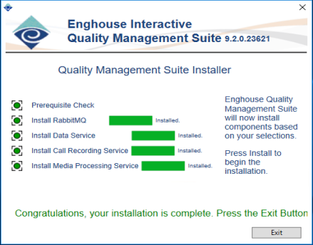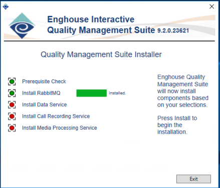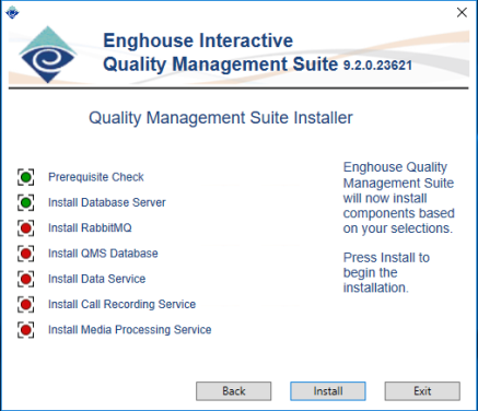 This screen shows progress as the various components are installed. A green indication means that the item has been or is already installed. Red indicates that it has not yet been installed. Which indicators appear depends on the items selected on the selection screen. For example, if only DataService is installed, the Call Recording Service and Media Processing Service indicators will not appear. Once the Install button is clicked, the install process will begin.