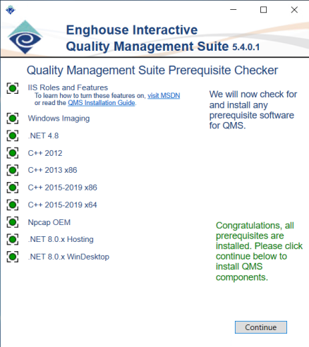 The Enghouse QM Suite Installer is an all-in-one install. This single installer includes all the components required for a standard QMS deployment, including prerequisites. There are two versions of the installer, one that bundles all the needed prerequisites and one that requires an internet connection to first download missing prerequisites before they can be installed.