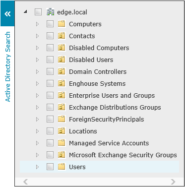 - Browse the Active Directory structure in the left most pane and select the box next to any users you want to import. Click the triangle to expand the Active Directory node. The triangle disappears when a node with no children is expanded. A user selected in the Active Directory browser appears in the import targets table. If you select or clear a container object in the Active Directory browser, then it causes all the contained users to be selected or cleared.