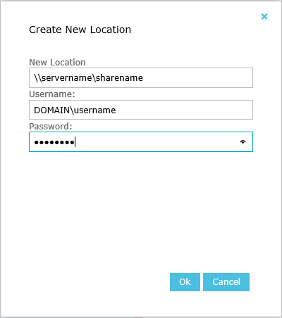 - Username - The username used to gain access to the new storage location. Username should be entered as Domain\Username or WorkgroupMachineName\Username.