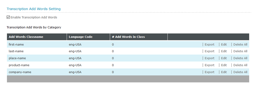 Add Words provides special categories of words that can help the transcription engine transcribe calls containing these special words. This section provides the ability to add lists of names for each category for any language that is assigned for transcription. There is a limit of 100 words per category per language.