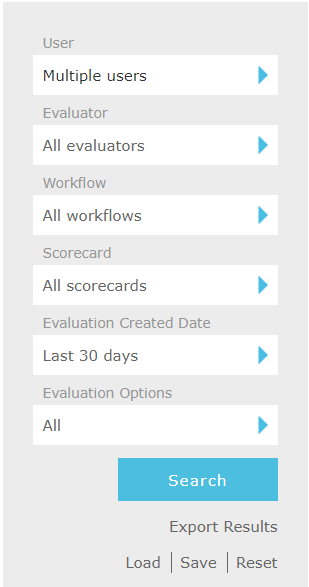 - Users to restrict search results by selected users or all users. The user list contains users that have an Agent Evaluation license and are managed by the logged in user. Administrators are presented with all users that have an Agent Evaluation license.