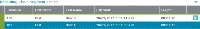 The recording details tab for recording chain segments will also contain the Recording Chain Segment List section. This table lists the extension, first name and last name of the user connected to the call during the recording along with the start time and the length of the recording segment. The recordings are listed in chronological order. In the recording chain segment list table, the row containing the selected recording (the recording displayed in the details tab) is highlighted.