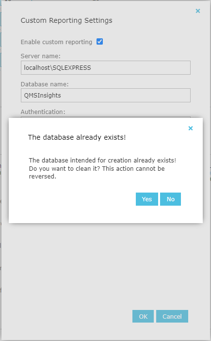 When enabling Custom Reporting with the same configuration of server name and database name you used in the past, a confirmation is needed. This is because QMSInsights database is not deleted when disabling Custom Reporting, but will be cleaned when re-enabled.