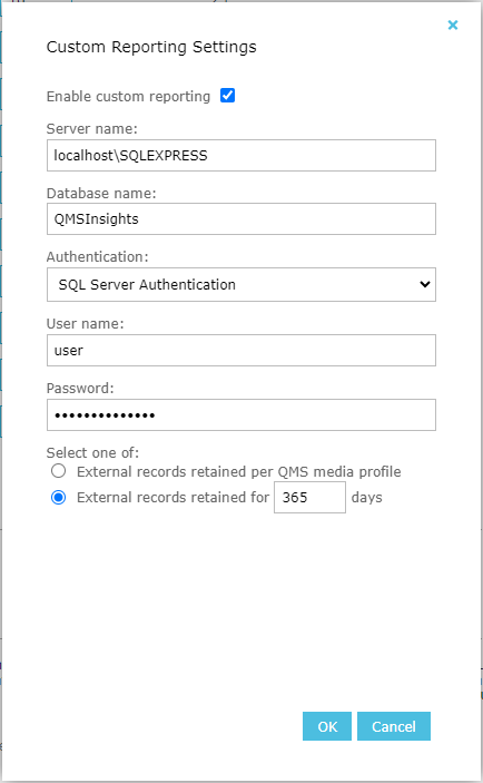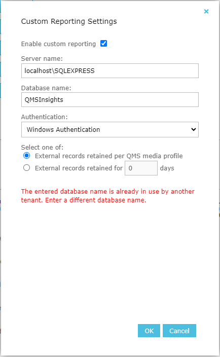 Please note that QMSInsights database is not deleted when disabling Custom Reporting, but will be cleaned if enabled with the same configuration of server name and database name.