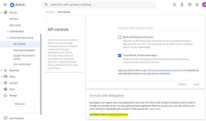 Open Google Admin Console. Click on Security, then Access and Data Control, then API Controls and finally on Manage Domain Wide Delegation.