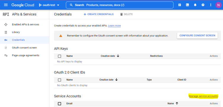 Under the Service Accounts section, click Manage Service Accounts, then Create Service Account (it does not matter what it is called).