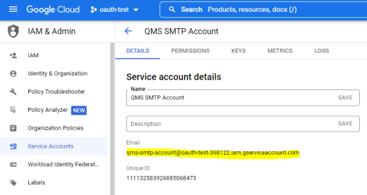 Go back to your service account in the developer console (IAM & Admin, Service Accounts) and click on the service account to bring up the details page. Make a note of the Email address. You will need this later for the QMS configuration.