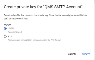 Then click on Keys, then Add Key. I recommend you use the JSON format. Creating a new key will download a JSON file to your machine. Don't lose this as you only get one chance to download the key, it cannot be recovered later. You will need the key later for the QMS Configuration.
