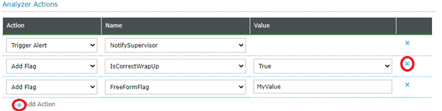 The Analyzer Actions section allows for the administration Flags and Alerts that are executed in the case of a text matching the defined analyzer.