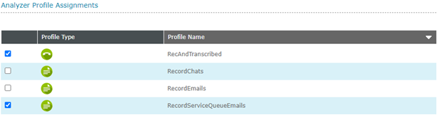 The Analyzer Profile Assignments section allows for the administration of any recording profiles assigned to an Analyzer. Assigning an Analyzer to a profile will automatically cause the Analyzer to be run against any text-based media recorded by the assigned profile. A profile is only available to be assigned to an Analyzer if it is a Text Recording Profile or a Call Recording Profile provisioned with transcription.
