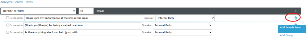 Rules are added to the search term set using the icons within the row where a new term is needed.