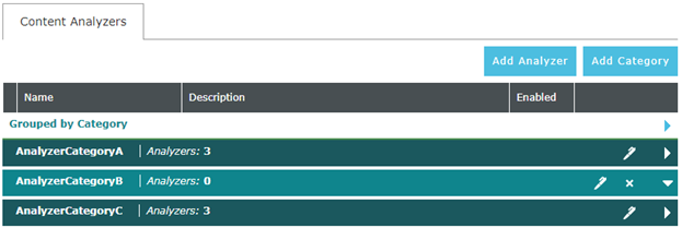 Content Analyzers are added, enabled or disabled, edited and deleted by expanding the category in the Content Analyzer tab and using the control icons for the particular Content Analyzer.