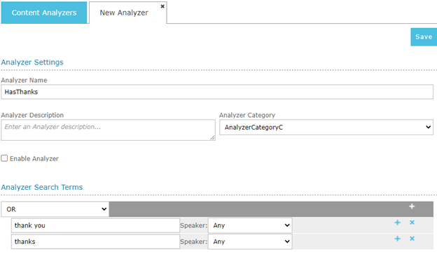 4. Click the Save button. The new Content Analyzer will be saved and added to the Content Analyzer tab for further editing.