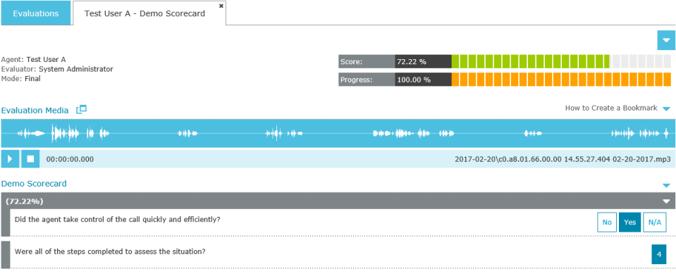 The evaluation scorecard section shows the questions, scores, audio bookmarks and notes for each scorecard question. The scorecard questions are automatically grouped by scorecard category. Each scorecard category displays the score percentage for the questions within that category.