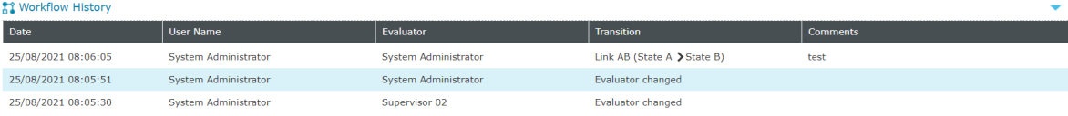 The workflow history section shows the history of the evaluator and workflow state changes if the evaluation has been linked to a workflow process. This section is collapsed by default. Click the icon to show the workflow history.