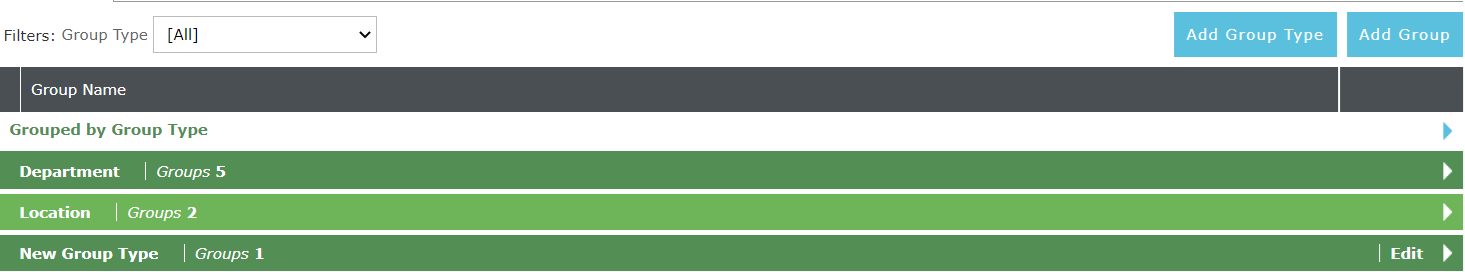 navigation icon and then click the Groups link from the administration sub-menu. The Groups tab displays containing the list of group types and groups. To edit a group, click the Edit button in the group row of the group you wish to edit, a new tab will open with the group name as the tab title.