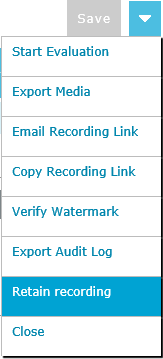 To override the scheduled deletion date open the drop down menu located at the top right of the recording details tab and click the Retain Recording menu item.