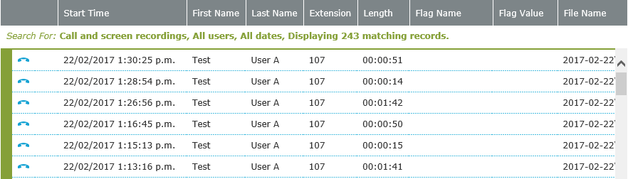 Any system flag can also be selected and viewed as a column. If you are using indial-modifiers, you can search for associated recordings by selecting the modifier name, modifier number or queue name. For example, for a Sales queue that has an associated modifier name VIP with a modifier number 8000, you can search for any associated recordings using the modifier name - VIP, the modifier number 8000 or the queue name Sales. |