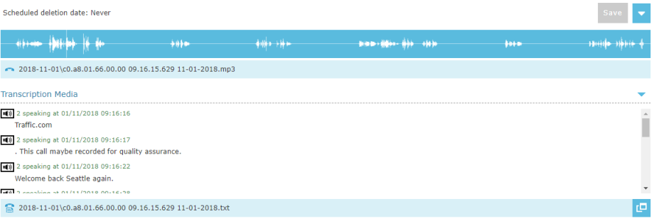 Users must have the Playback Recording permission in their Security Profile to view transcriptions. If their profile also contains the Change System Settings permission they can also access the audit log events for the call recording on the recording details tab. Optionally, an additional authorized user may be required to enter their credentials before playback is allowed. See Authorized User for Playback Option for more details. |