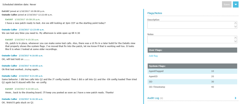 The chat recording tab also contains any Flags, Description, and Notes that have been applied to the chat recording; you can edit these as required. If you have the appropriate permission, the foot of the page also displays the Audit Log records for the chat recording.