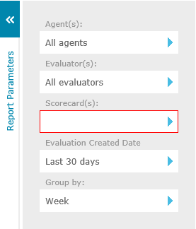 - Scorecard to filter report results by scorecard or scorecard category. Selecting a scorecard category (highlighted in green) will include all scorecards in that category in the report results. You must select a scorecard to run this report, selecting all scorecards is not an option.