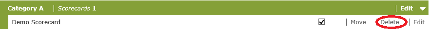 - Expand the scorecard categories on the scorecard table until you find the scorecard you need to delete, then click the Delete link on the selected scorecard.